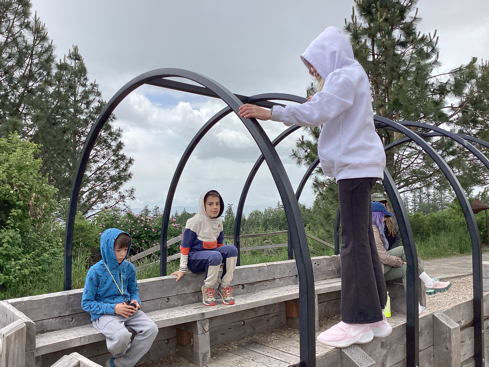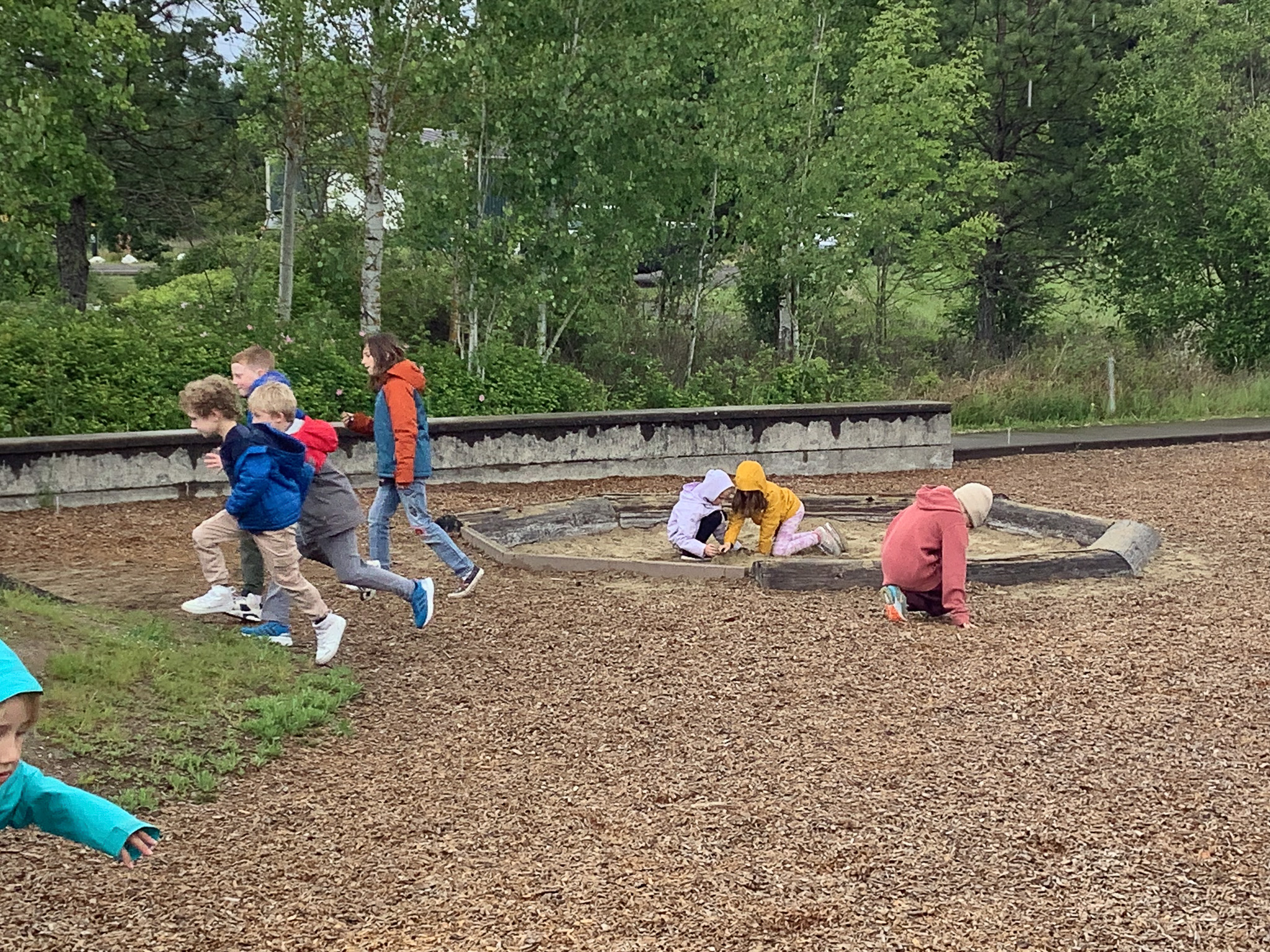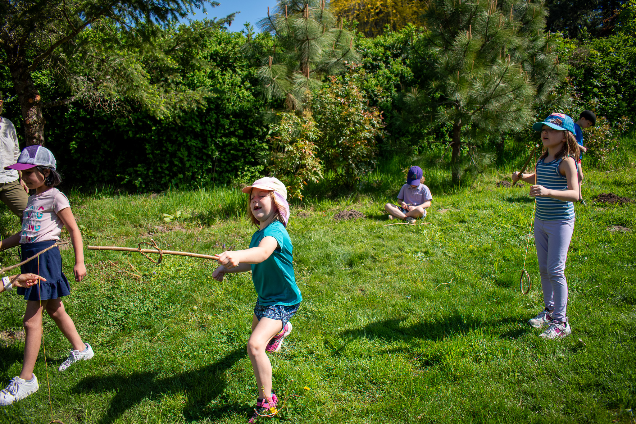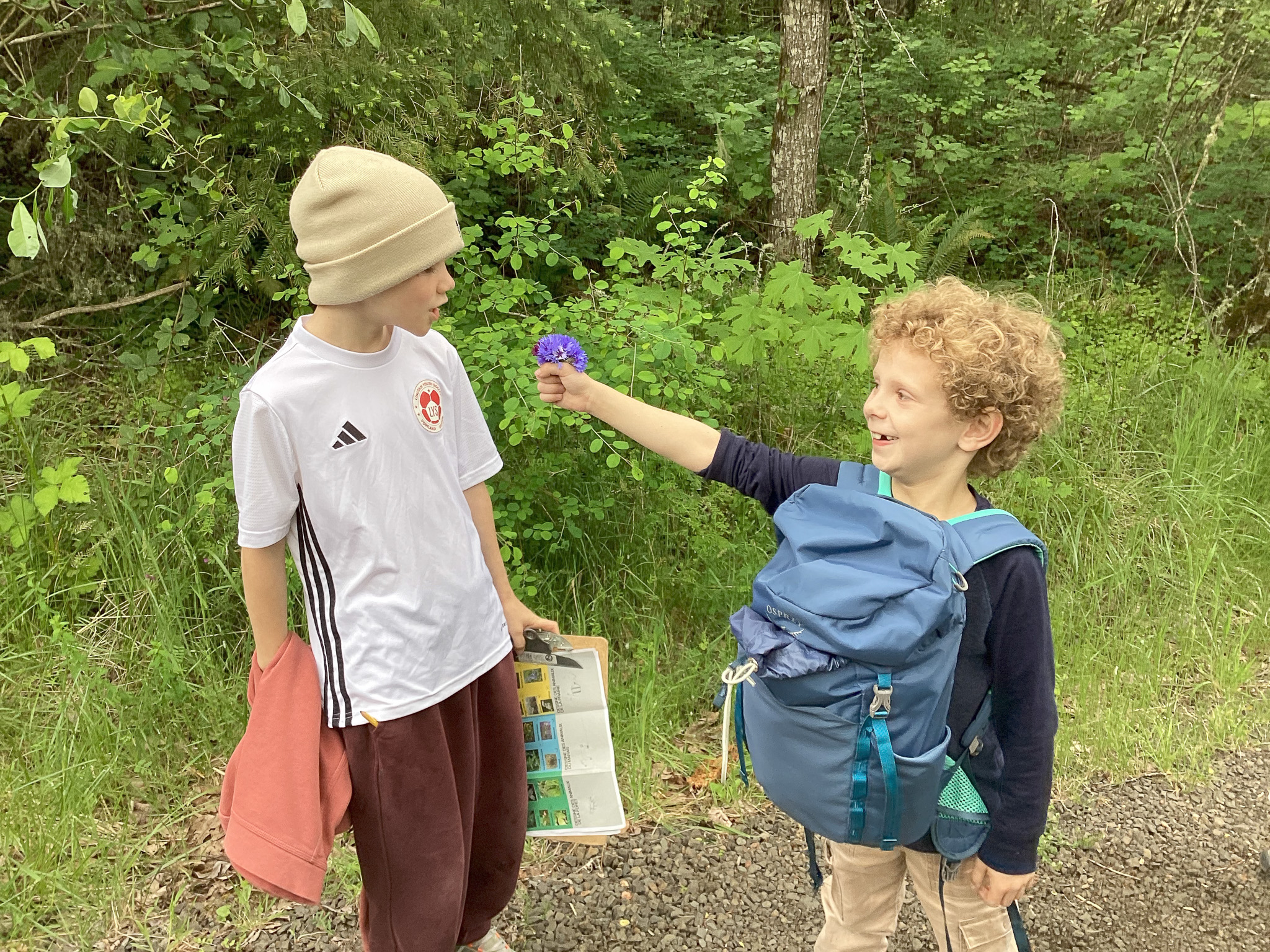 First graders had their field studies on campus on May 1. Christine and Clifton Bruno from the Wasco Tribe spent the day on campus with the students. The day started with a presentation on salmon and how important salmon is and was to indigenous communities. After the presentation, the classes rotated through two different stations. Clifton took students to make games in the meadow using sticks and string. They created toys using the materials and then played together and independently. Christine took a group of students into the French International forest to collect herbs and other materials to brew a tea. She taught the students to identify different plants and showed them which ones were safe to consume.