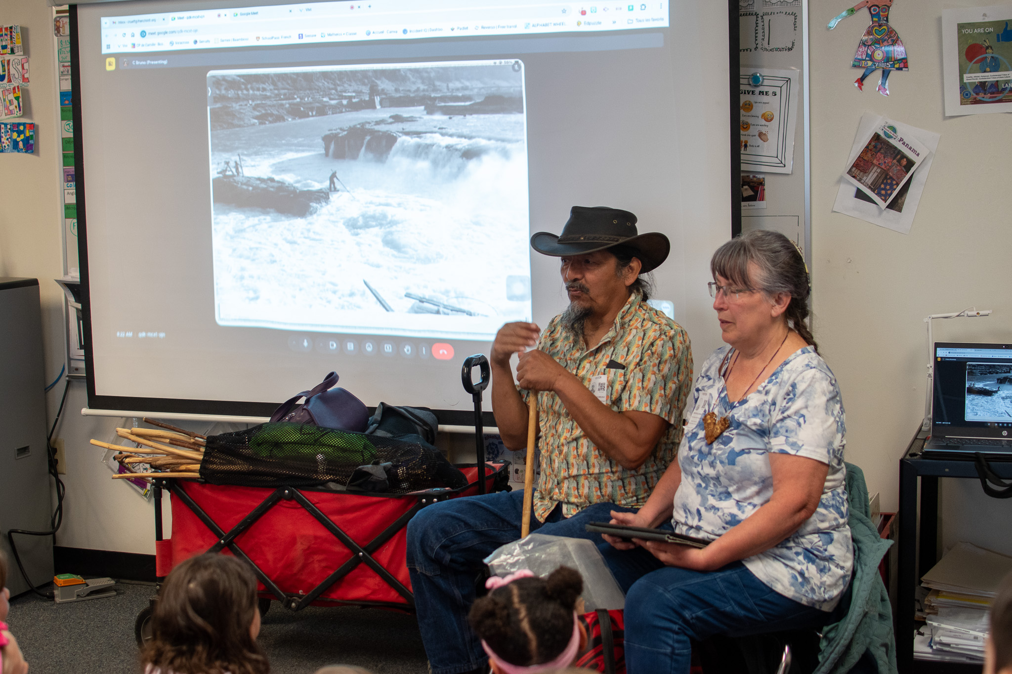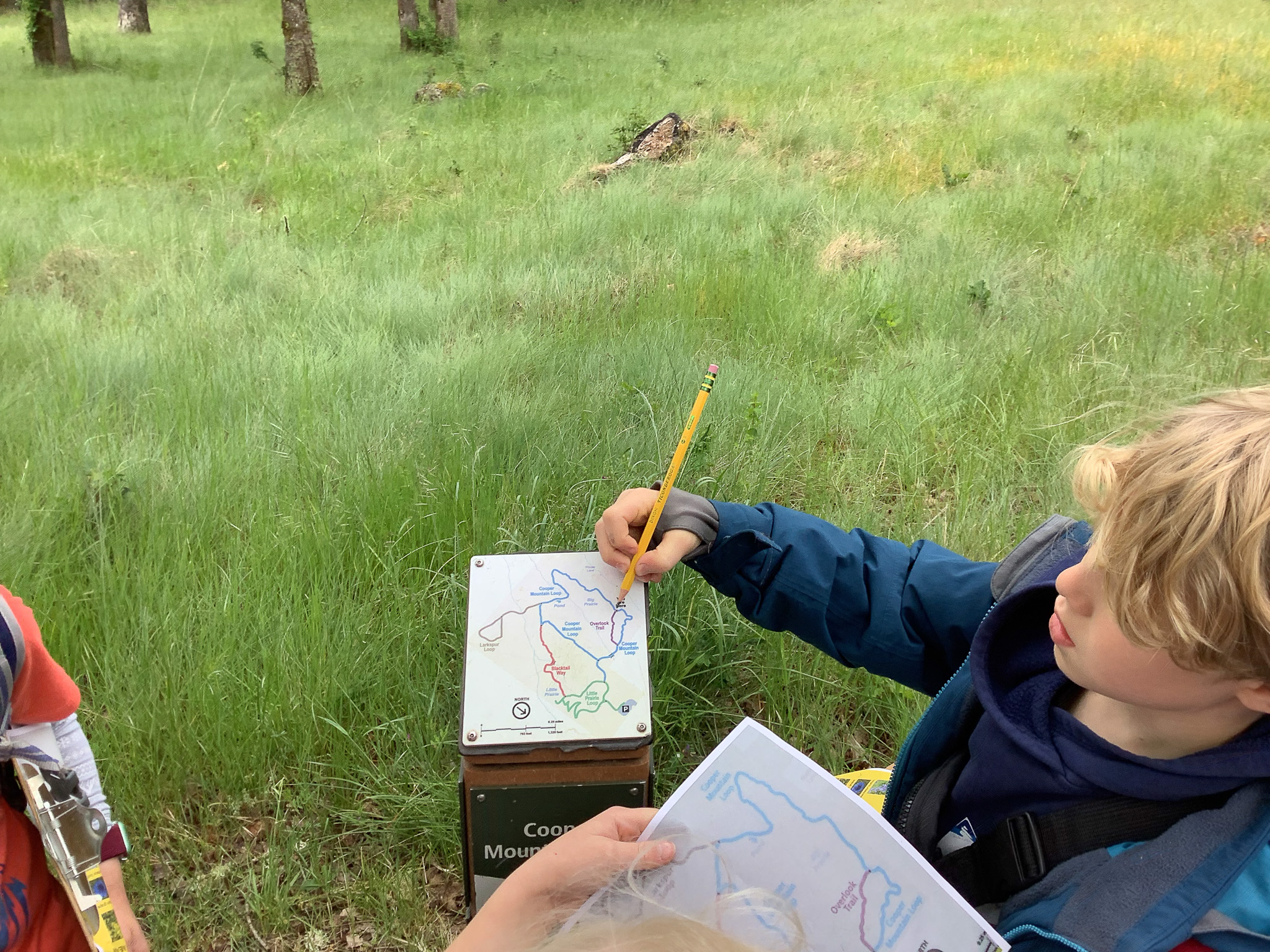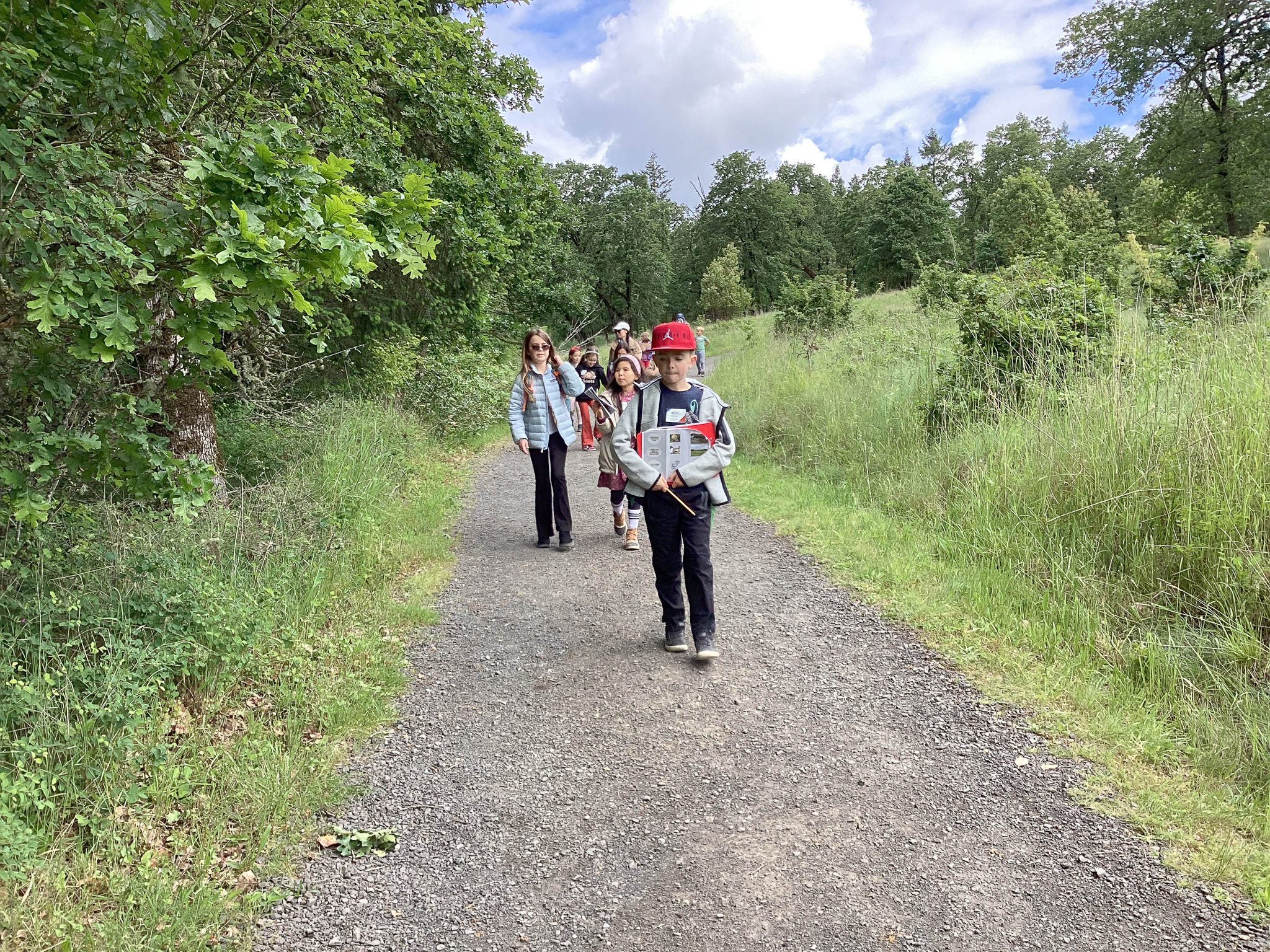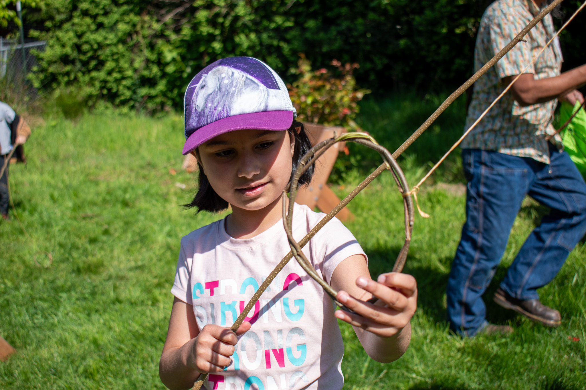 First graders had their field studies on campus on May 1. Christine and Clifton Bruno from the Wasco Tribe spent the day on campus with the students. The day started with a presentation on salmon and how important salmon is and was to indigenous communities. After the presentation, the classes rotated through two different stations. Clifton took students to make games in the meadow using sticks and string. They created toys using the materials and then played together and independently. Christine took a group of students into the French International forest to collect herbs and other materials to brew a tea. She taught the students to identify different plants and showed them which ones were safe to consume.