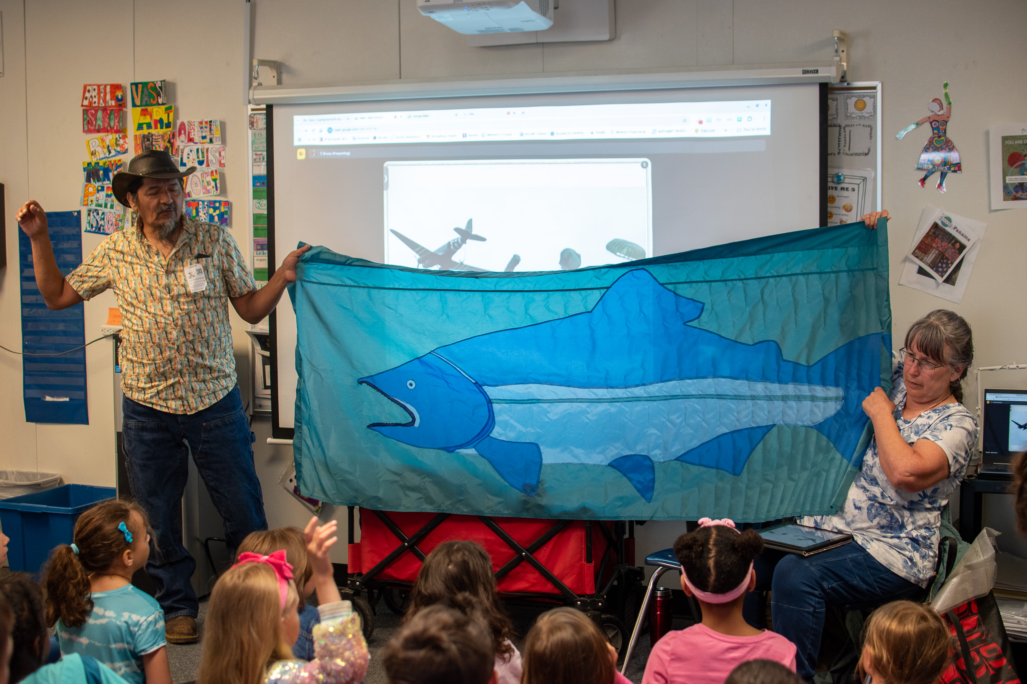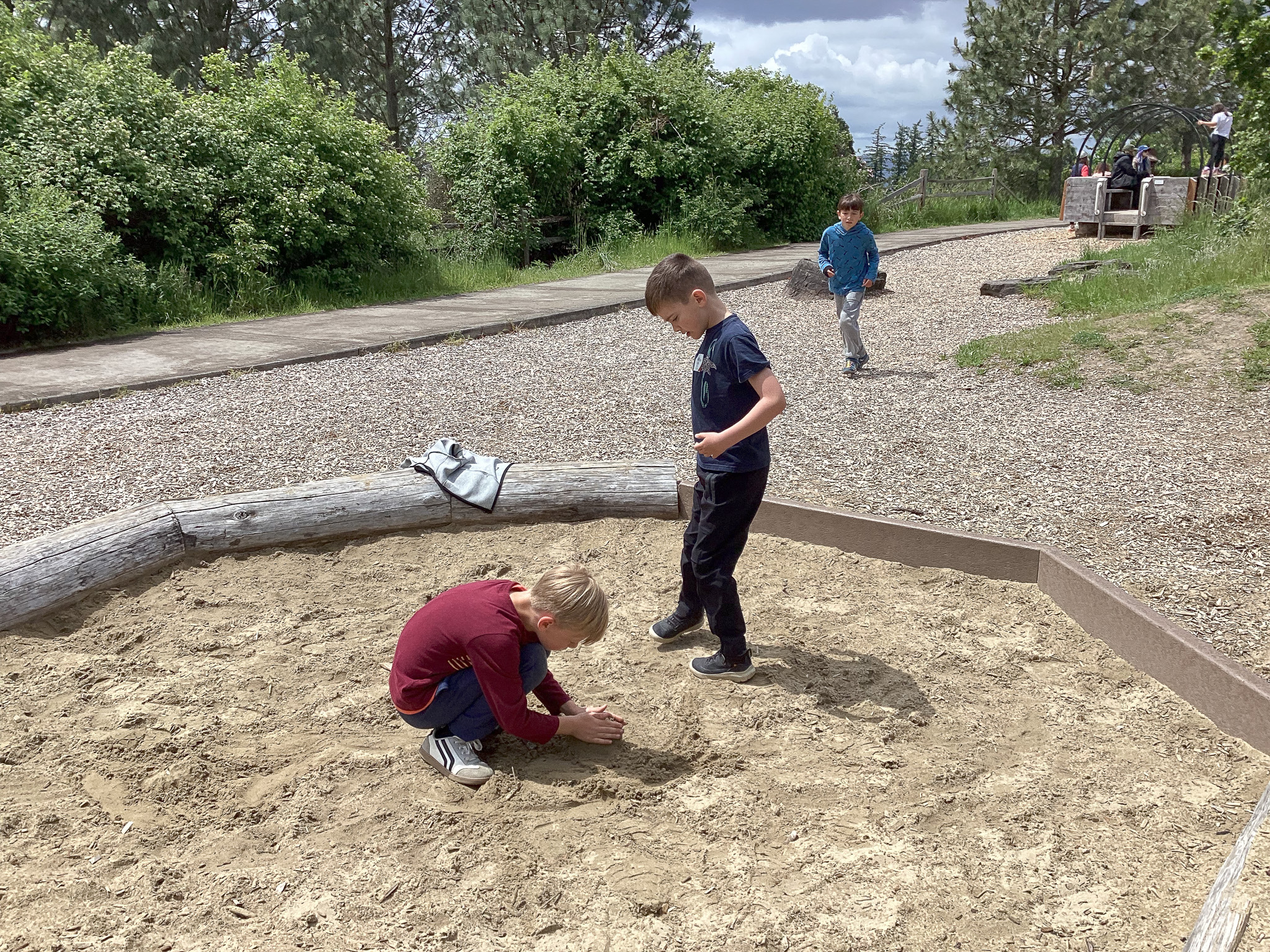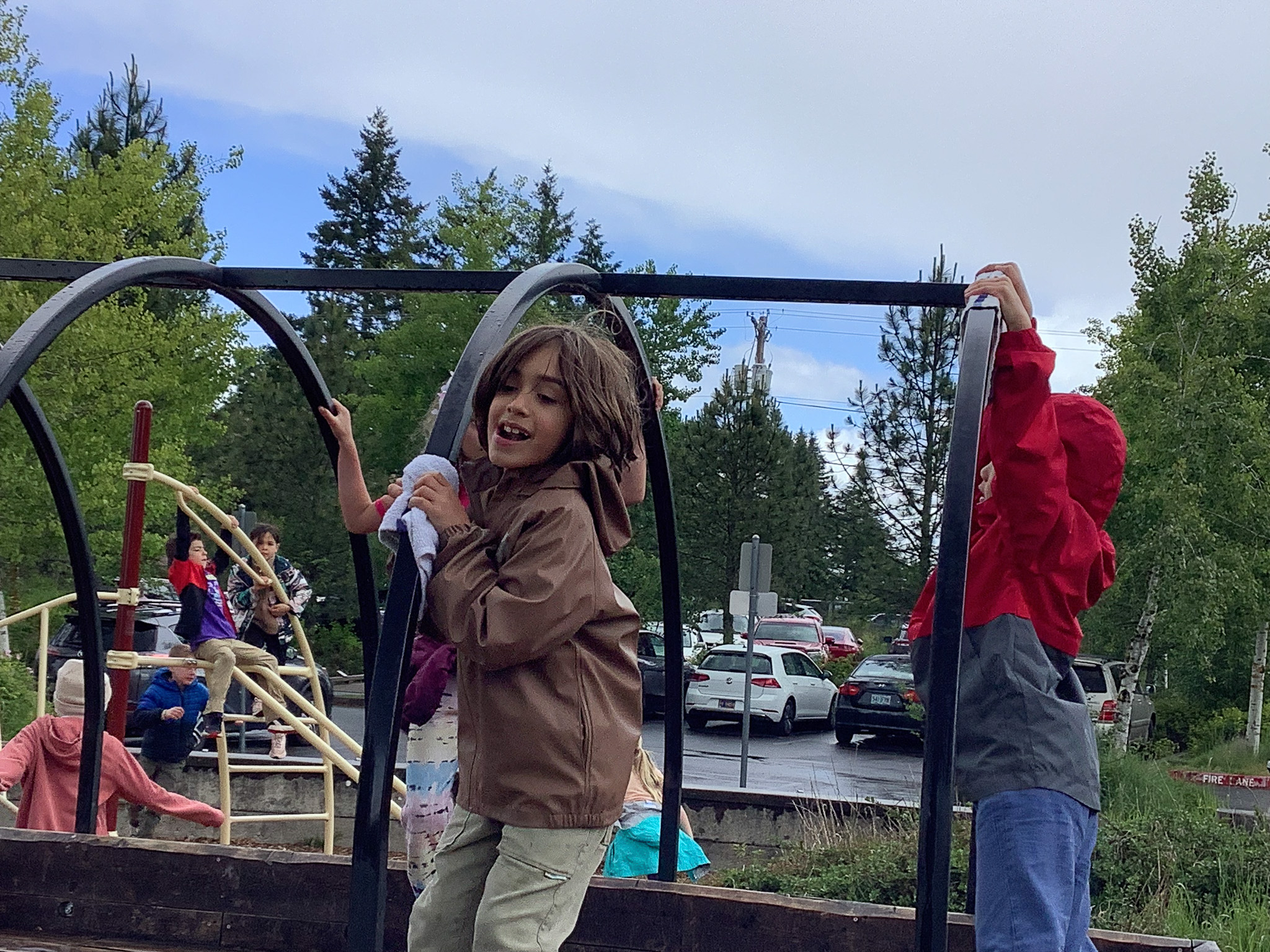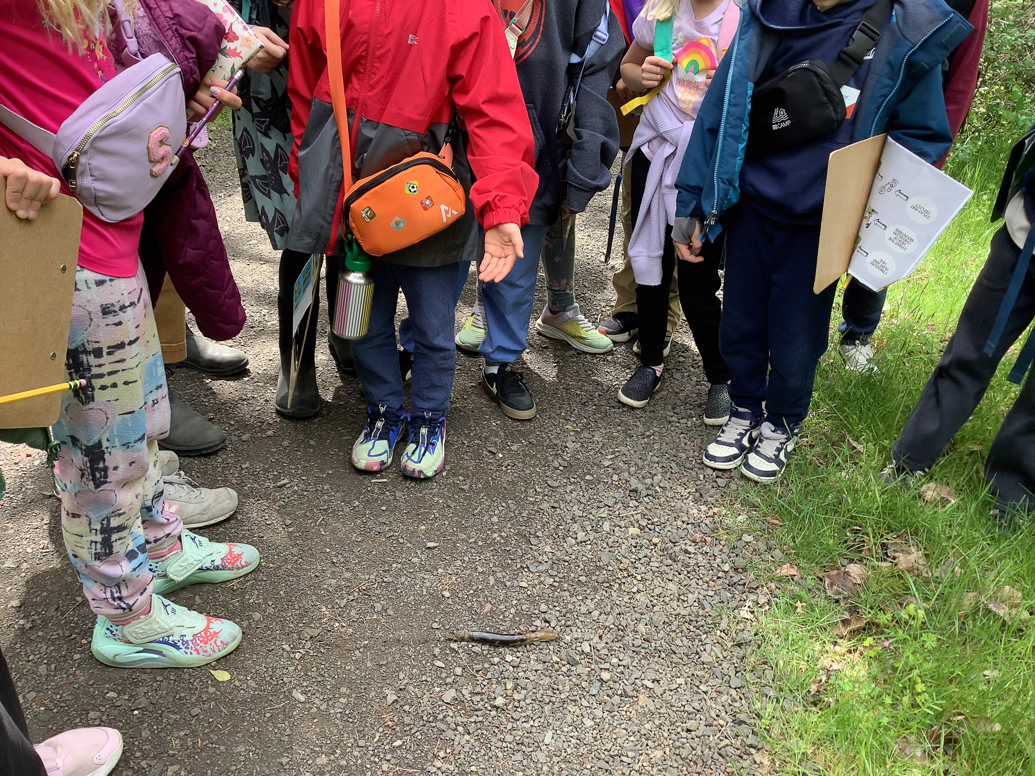 First graders had their field studies on campus on May 1. Christine and Clifton Bruno from the Wasco Tribe spent the day on campus with the students. The day started with a presentation on salmon and how important salmon is and was to indigenous communities. After the presentation, the classes rotated through two different stations. Clifton took students to make games in the meadow using sticks and string. They created toys using the materials and then played together and independently. Christine took a group of students into the French International forest to collect herbs and other materials to brew a tea. She taught the students to identify different plants and showed them which ones were safe to consume.