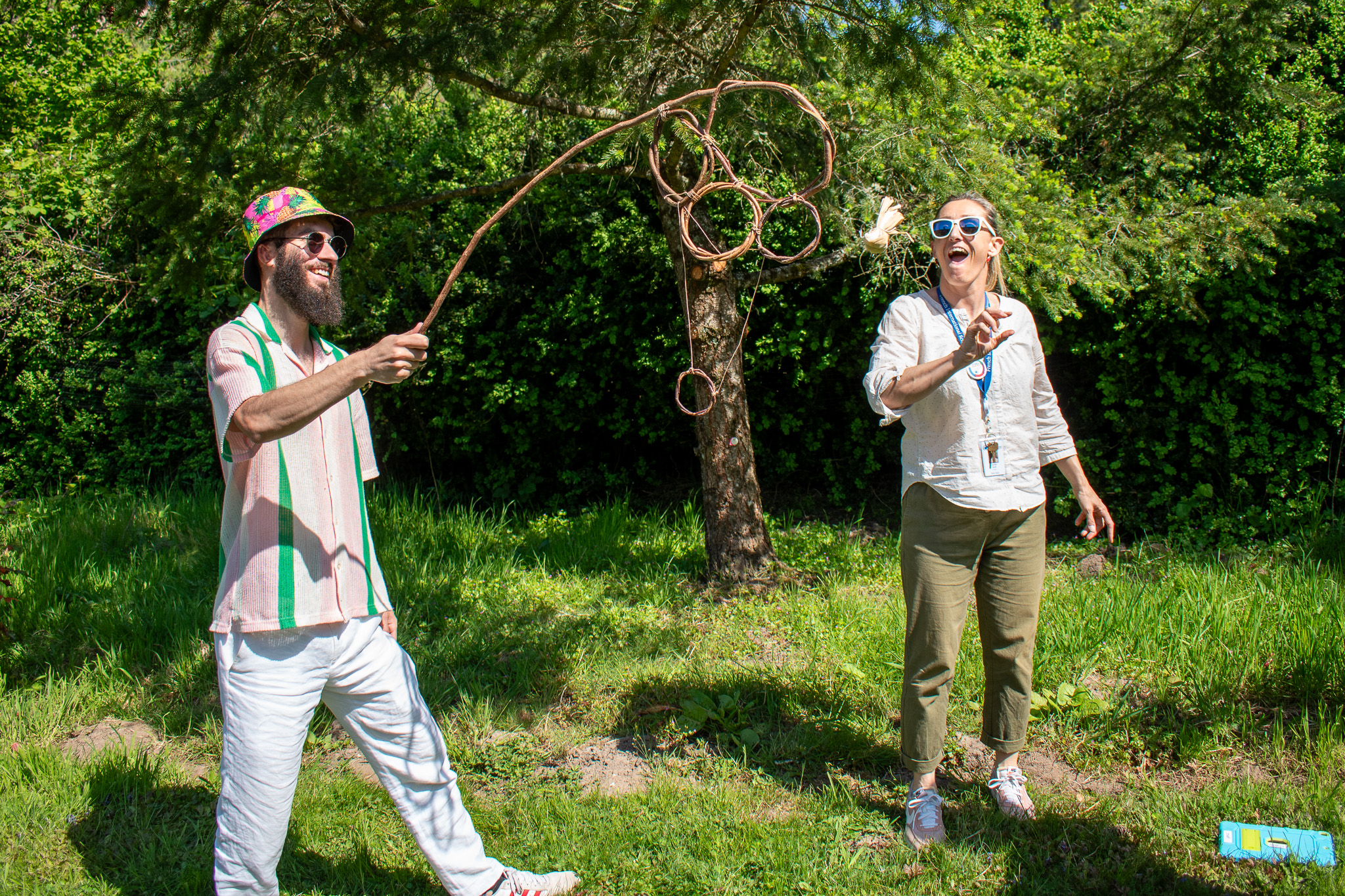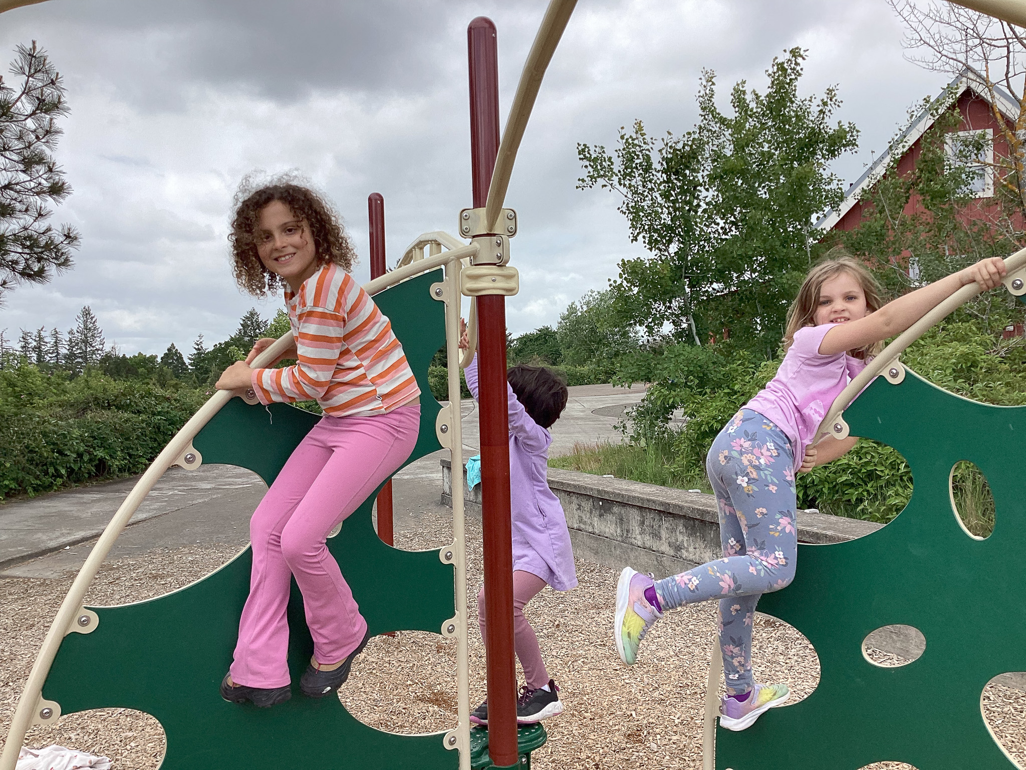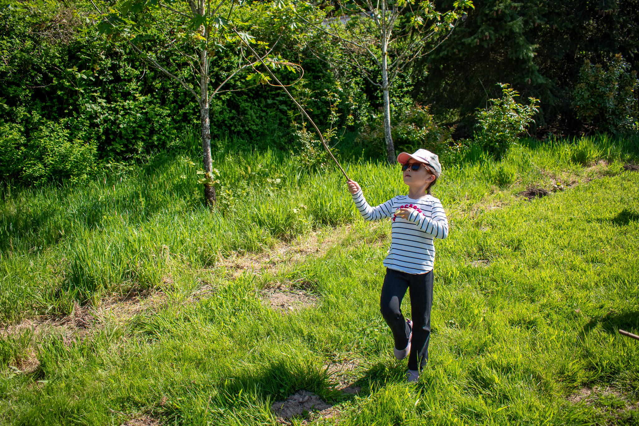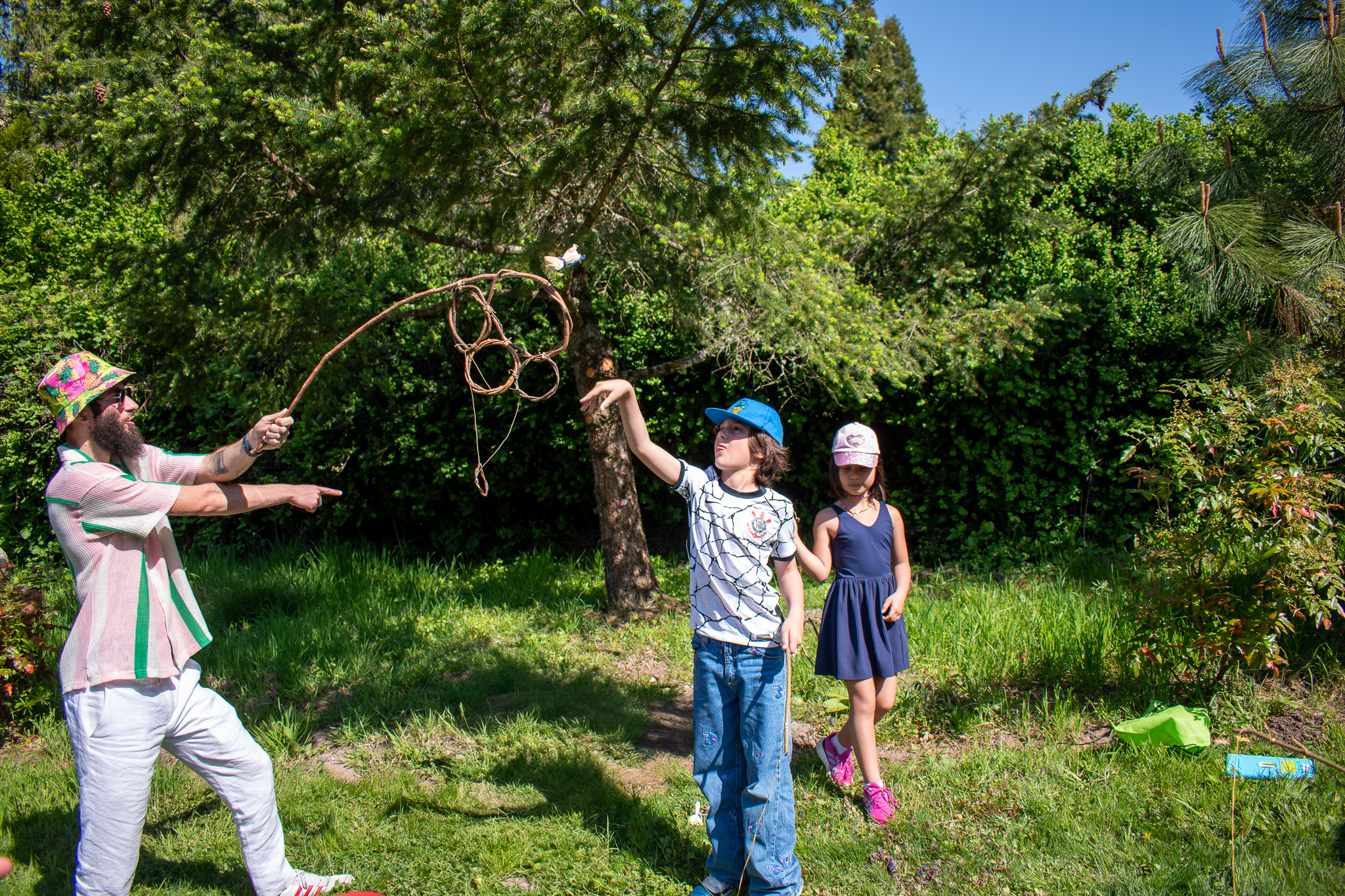 First graders had their field studies on campus on May 1. Christine and Clifton Bruno from the Wasco Tribe spent the day on campus with the students. The day started with a presentation on salmon and how important salmon is and was to indigenous communities. After the presentation, the classes rotated through two different stations. Clifton took students to make games in the meadow using sticks and string. They created toys using the materials and then played together and independently. Christine took a group of students into the French International forest to collect herbs and other materials to brew a tea. She taught the students to identify different plants and showed them which ones were safe to consume.