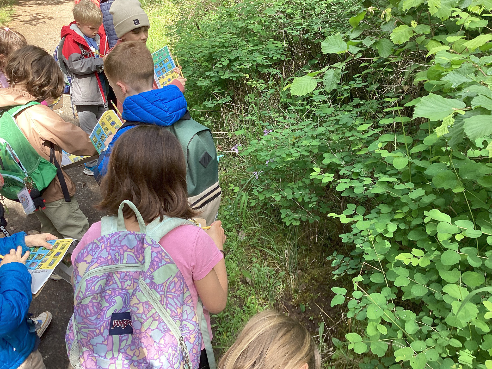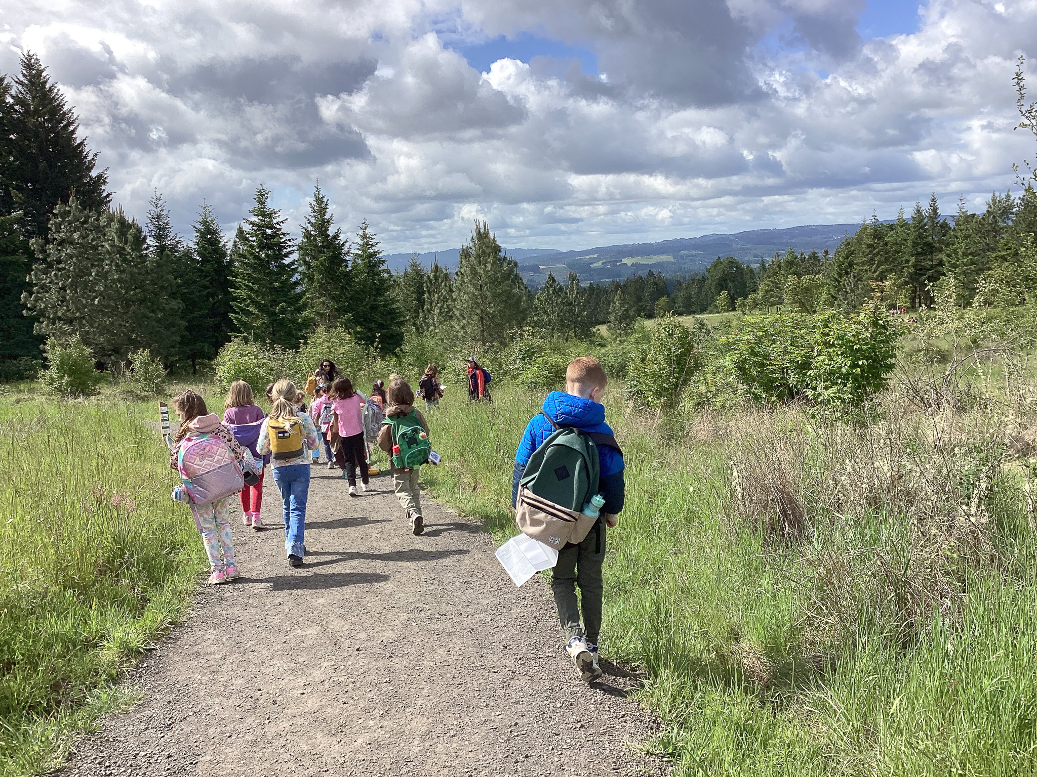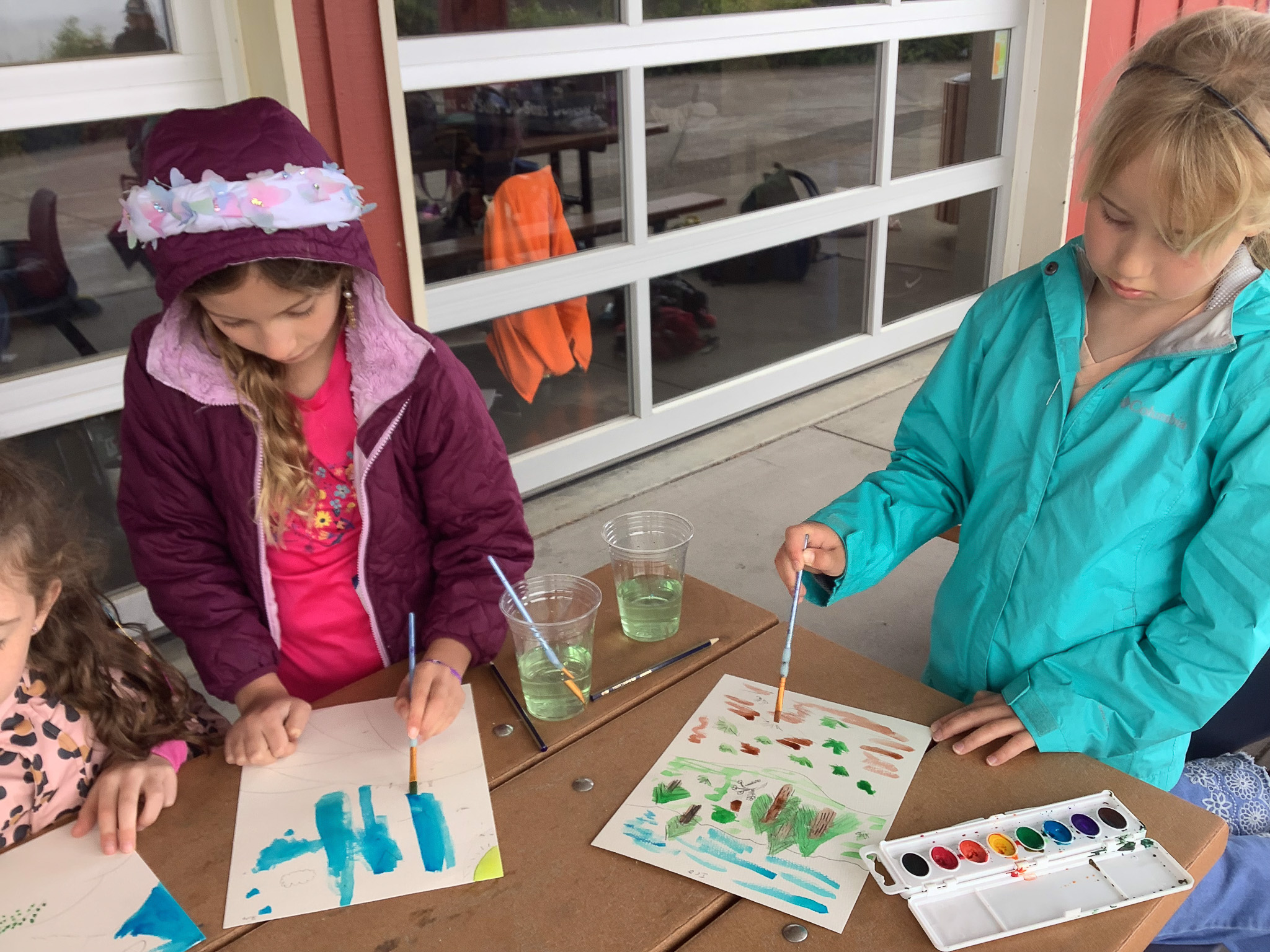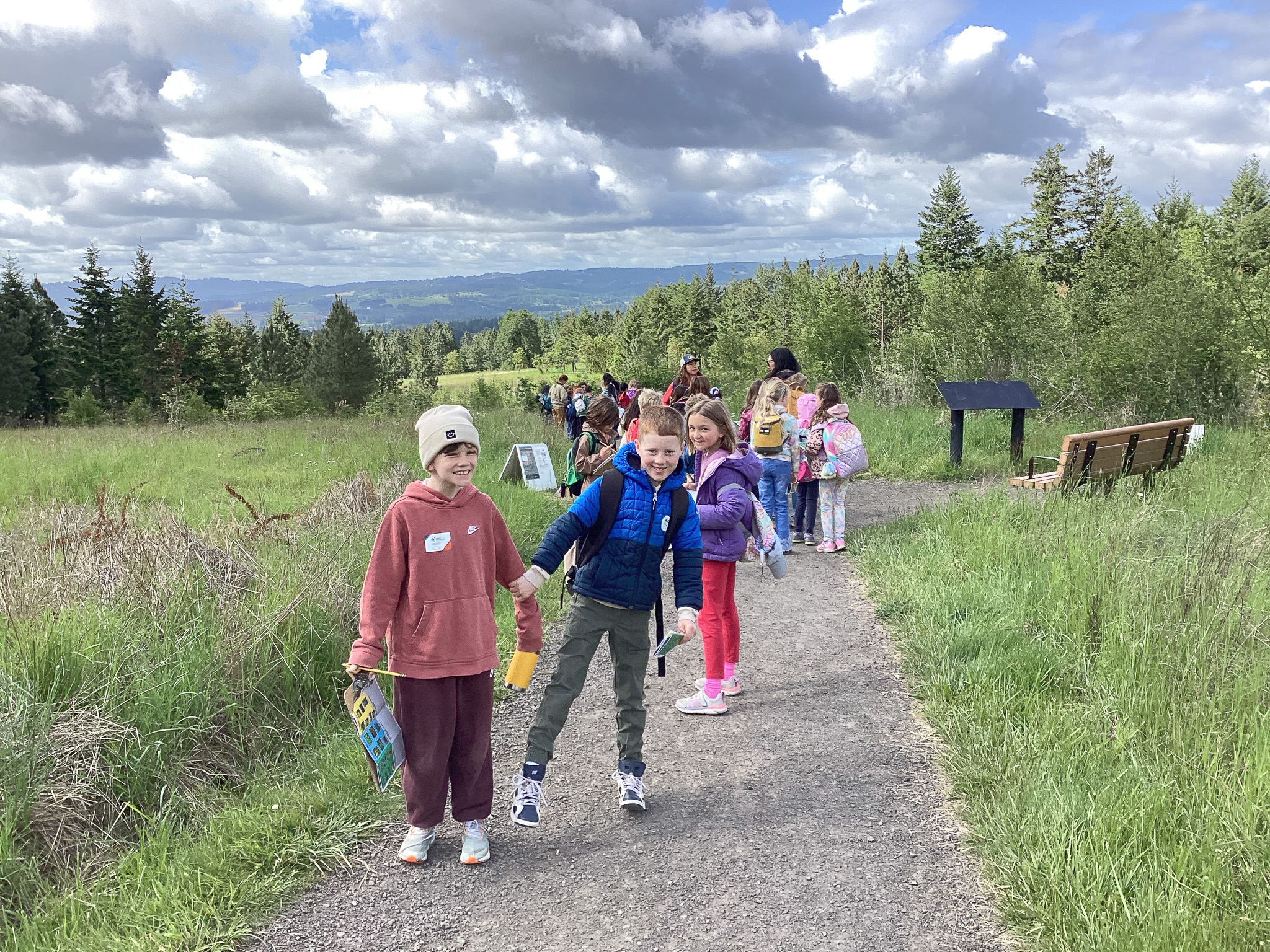 Second graders headed off campus to Cooper Mountain Nature Park for their field studies. After they arrived at the park, they went on a hike together. They looked for different plants and animals, trying to identify them with a scavenger hunt. They had lunch and spent time playing. In the afternoon, they painted the landscapes of the park with art teacher, Alex.