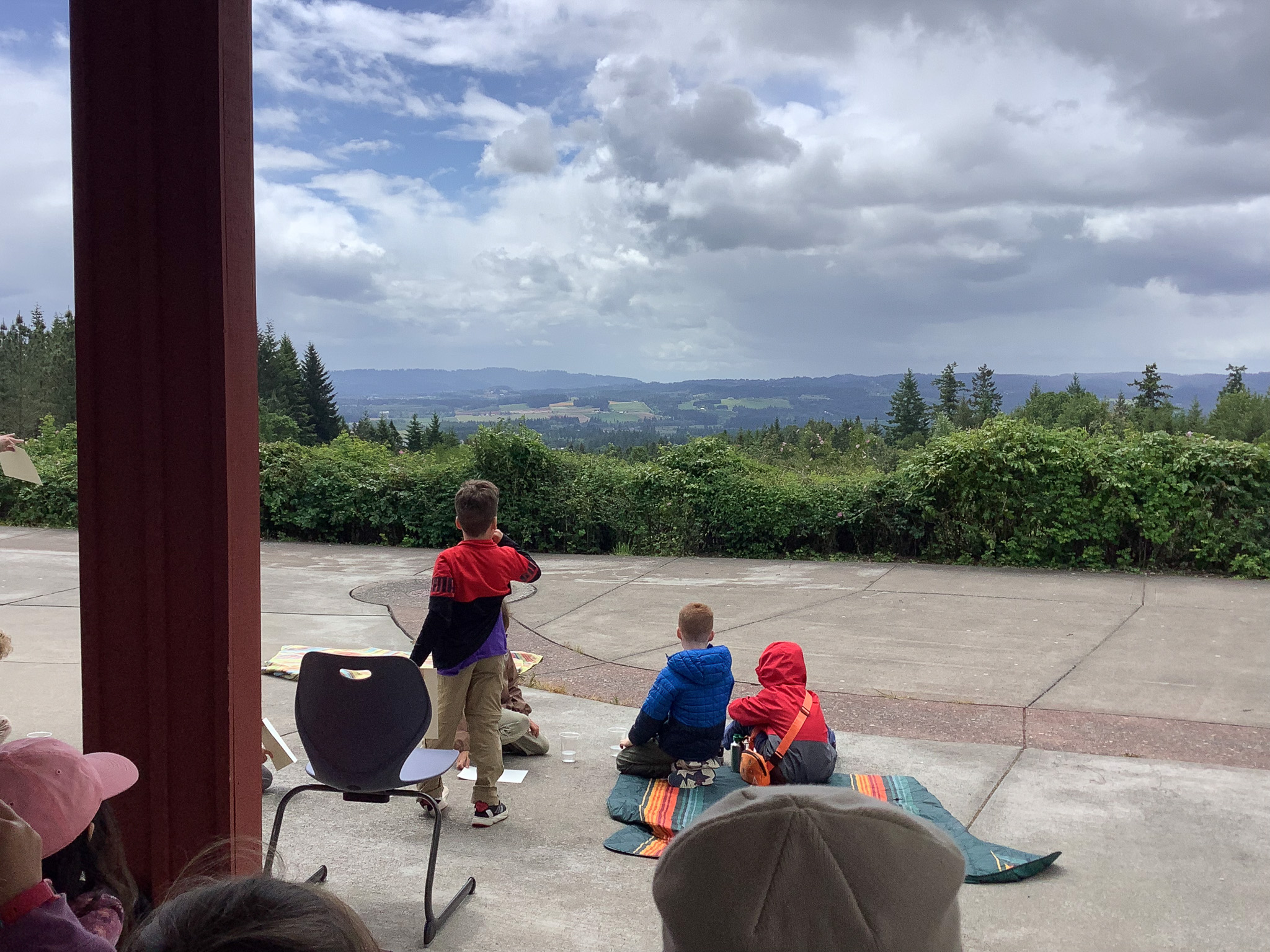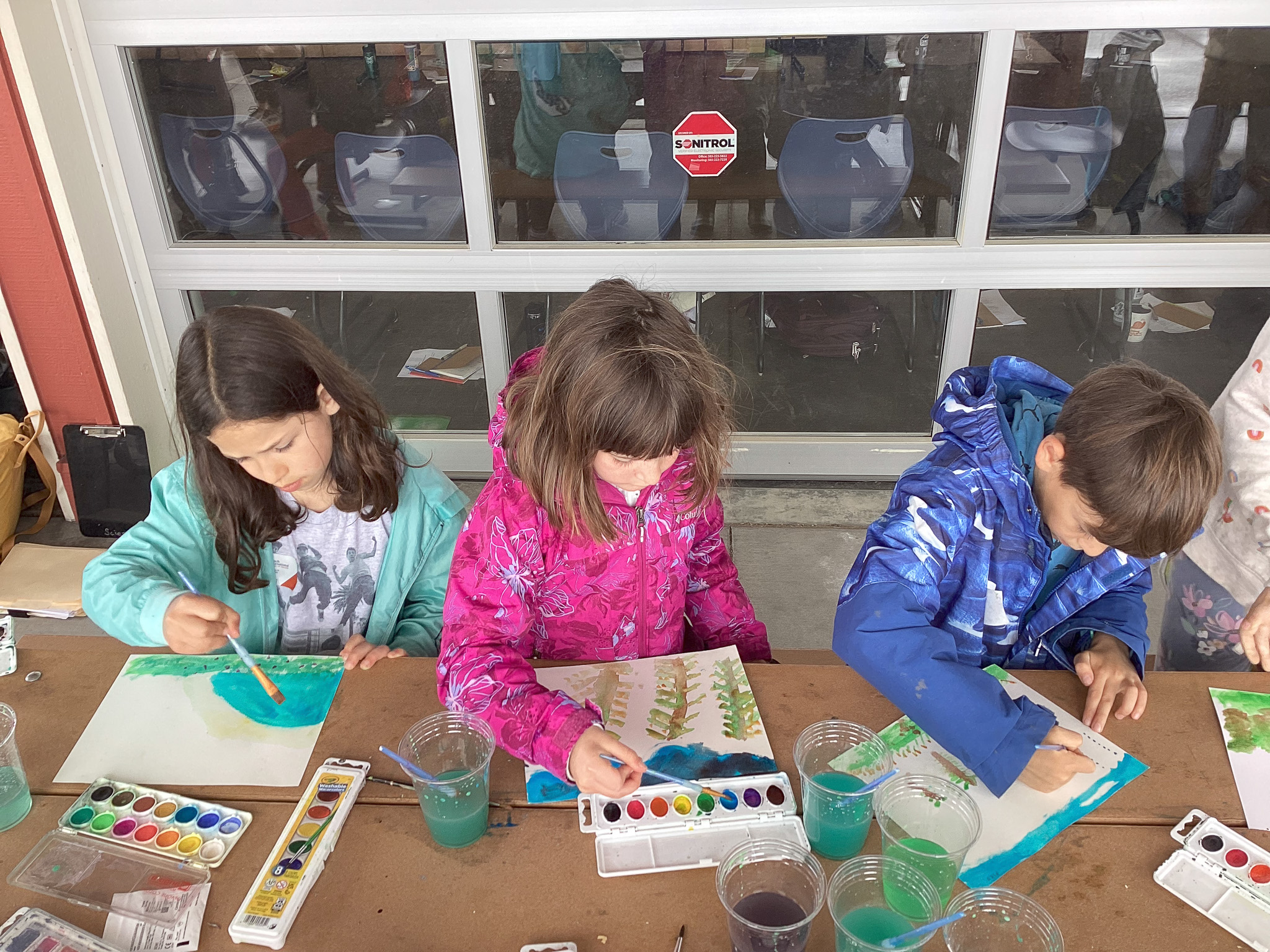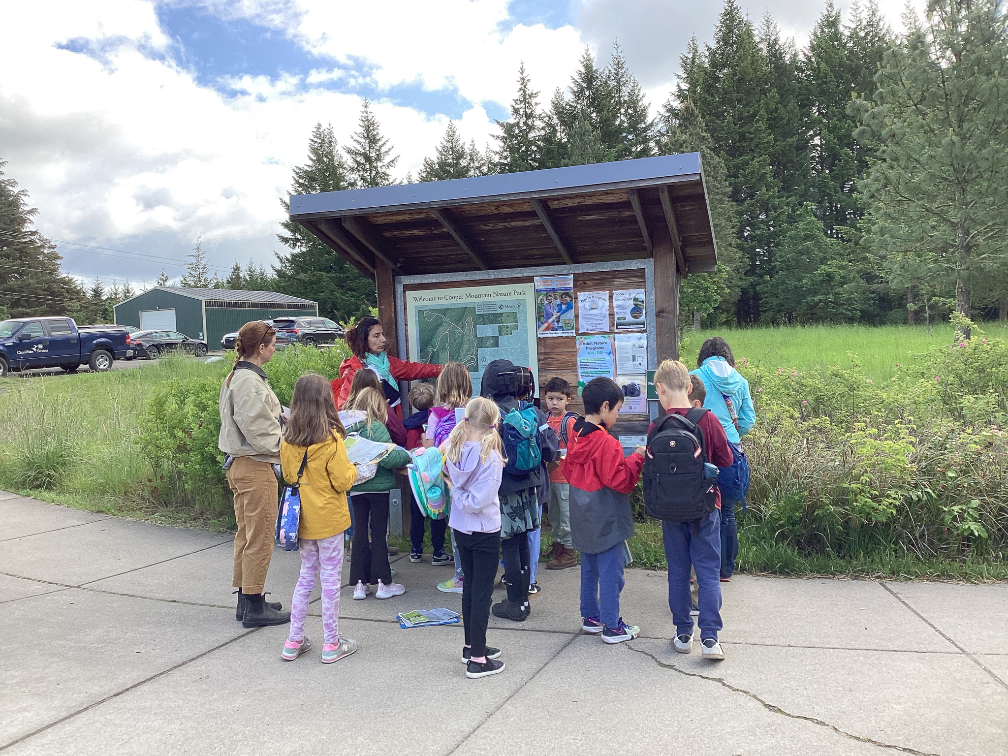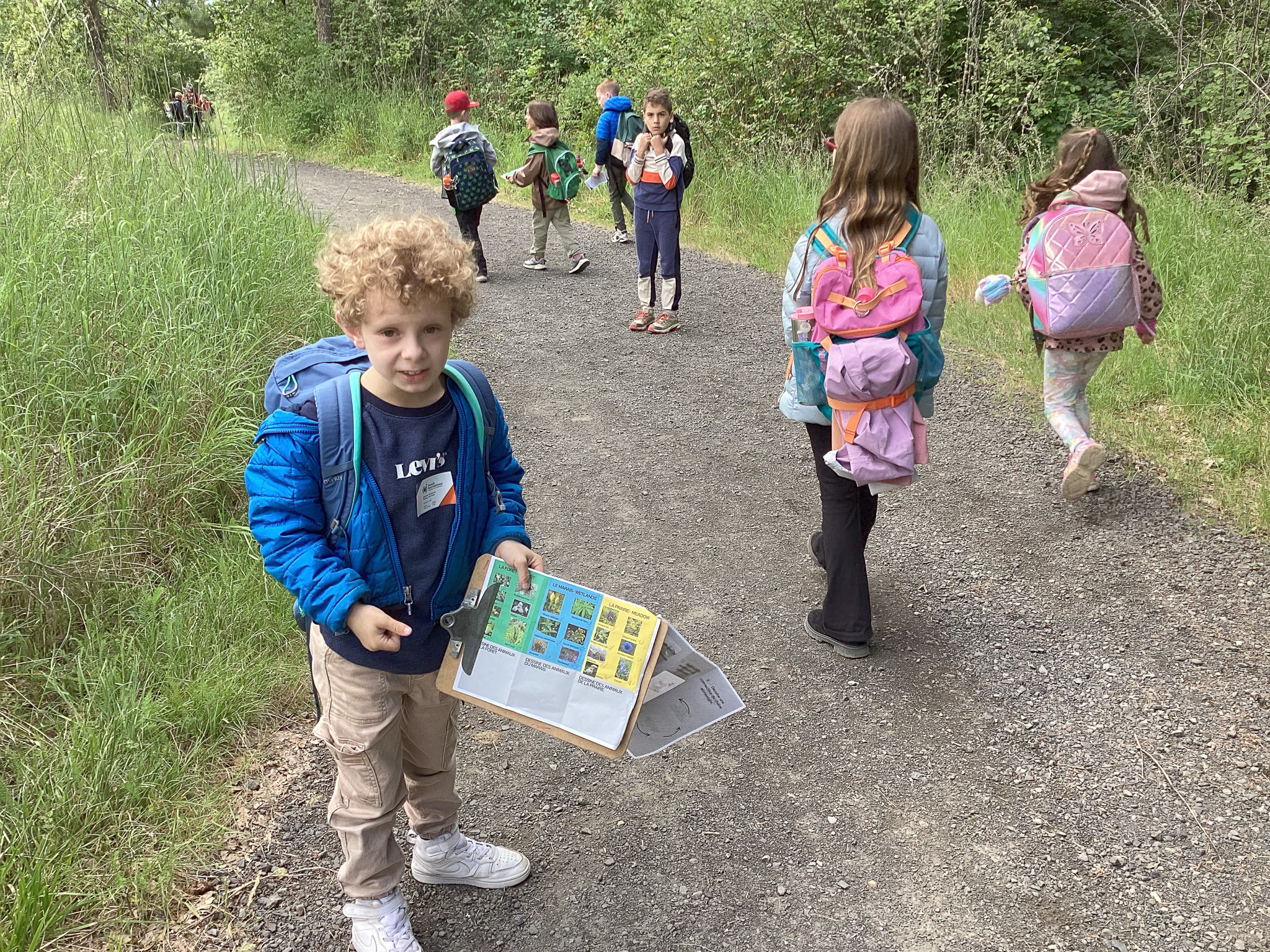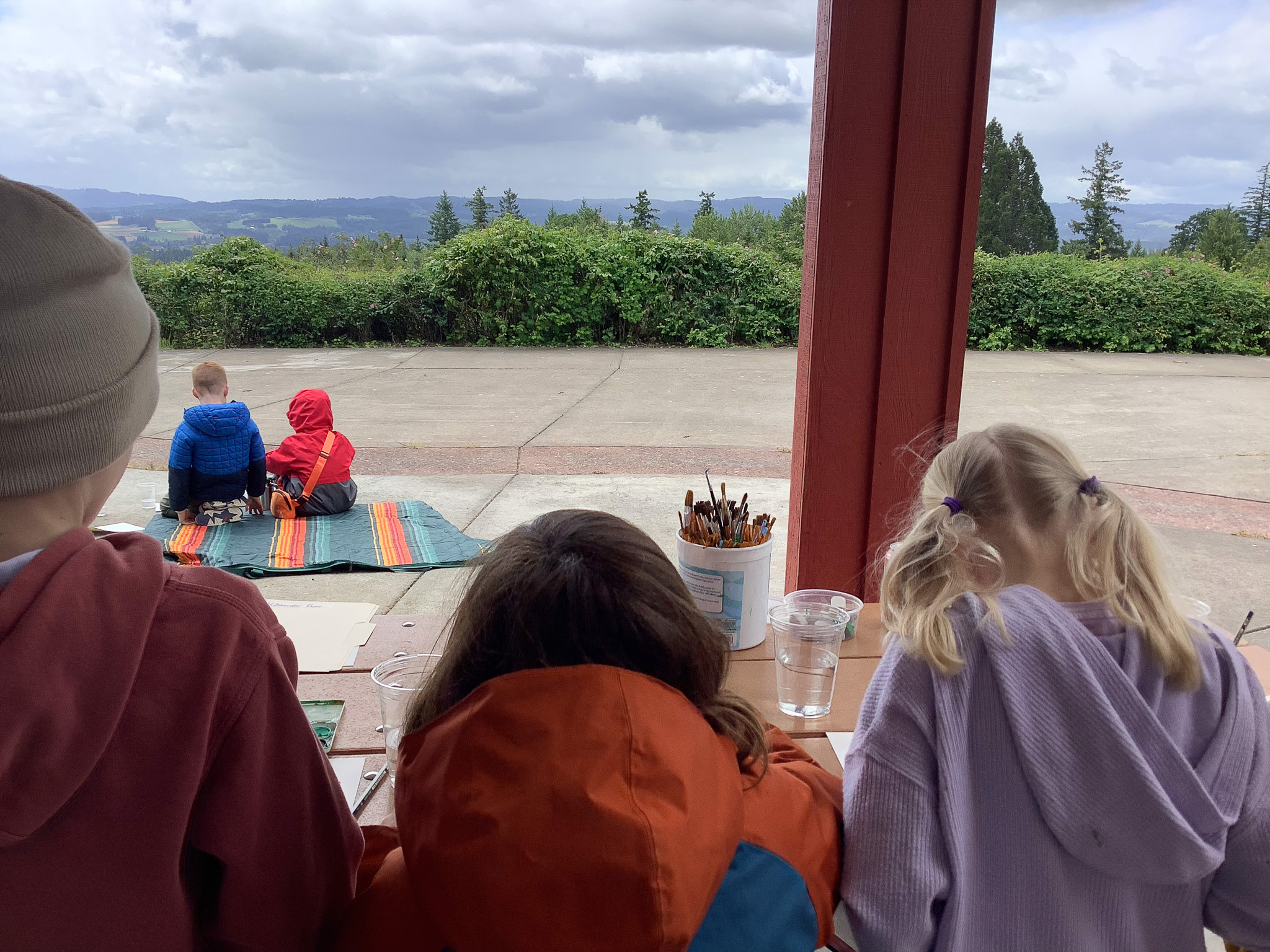Second graders headed off campus to Cooper Mountain Nature Park for their field studies. After they arrived at the park, they went on a hike together. They looked for different plants and animals, trying to identify them with a scavenger hunt. They had lunch and spent time playing. In the afternoon, they painted the landscapes of the park with art teacher, Alex.
