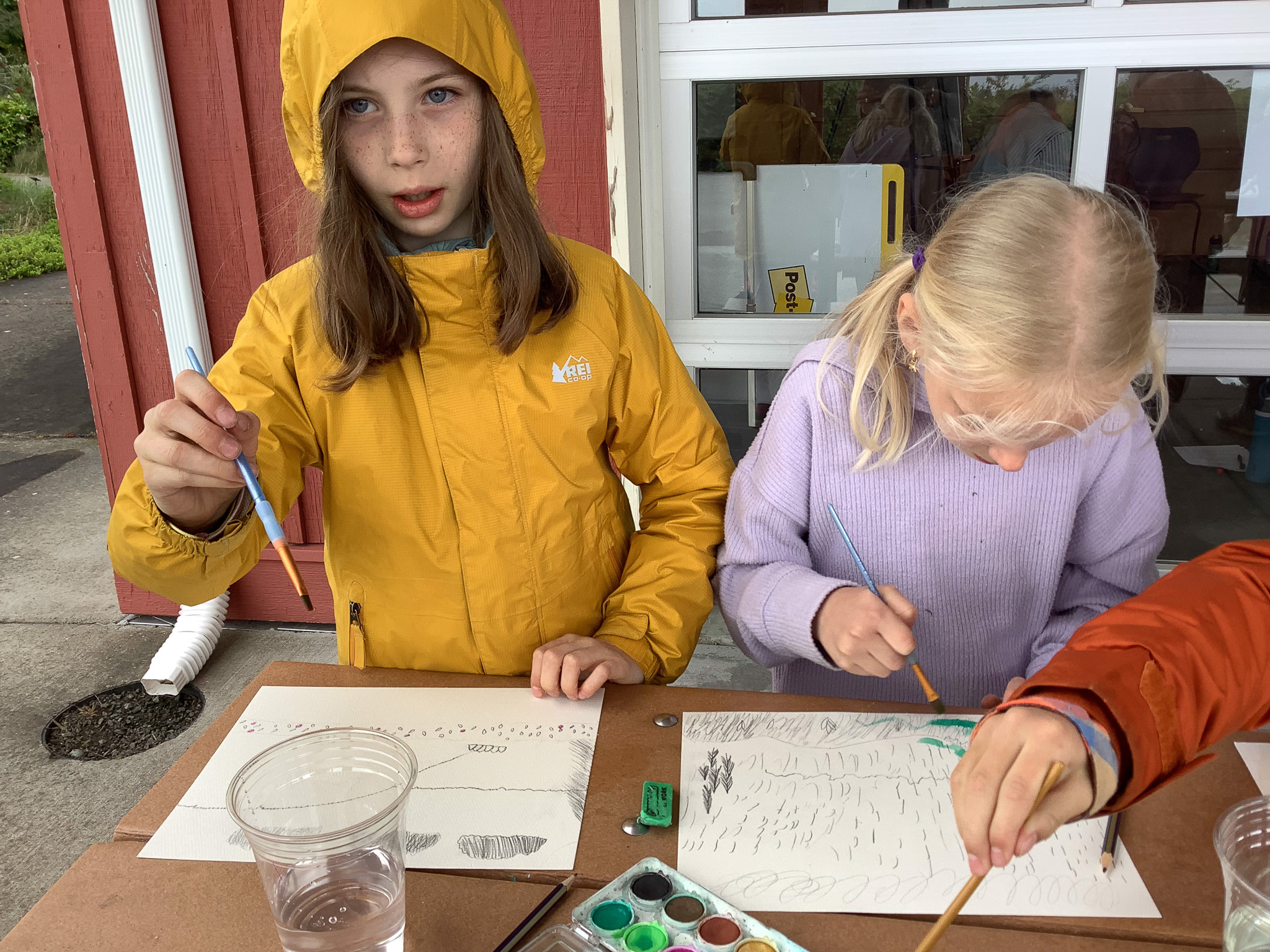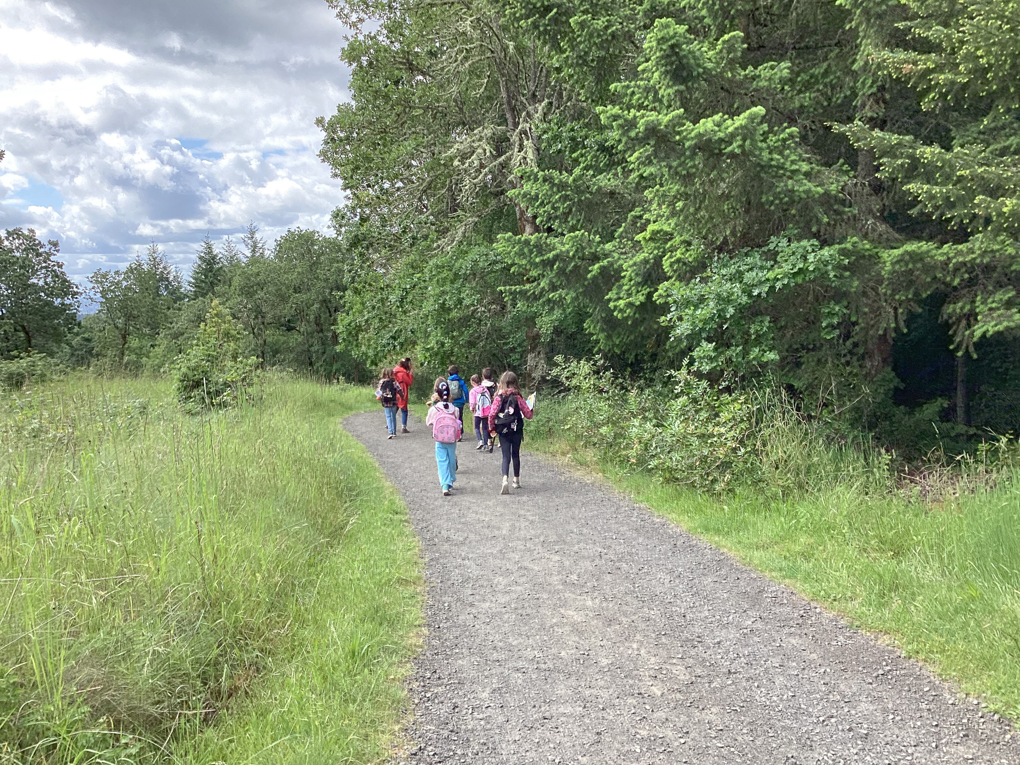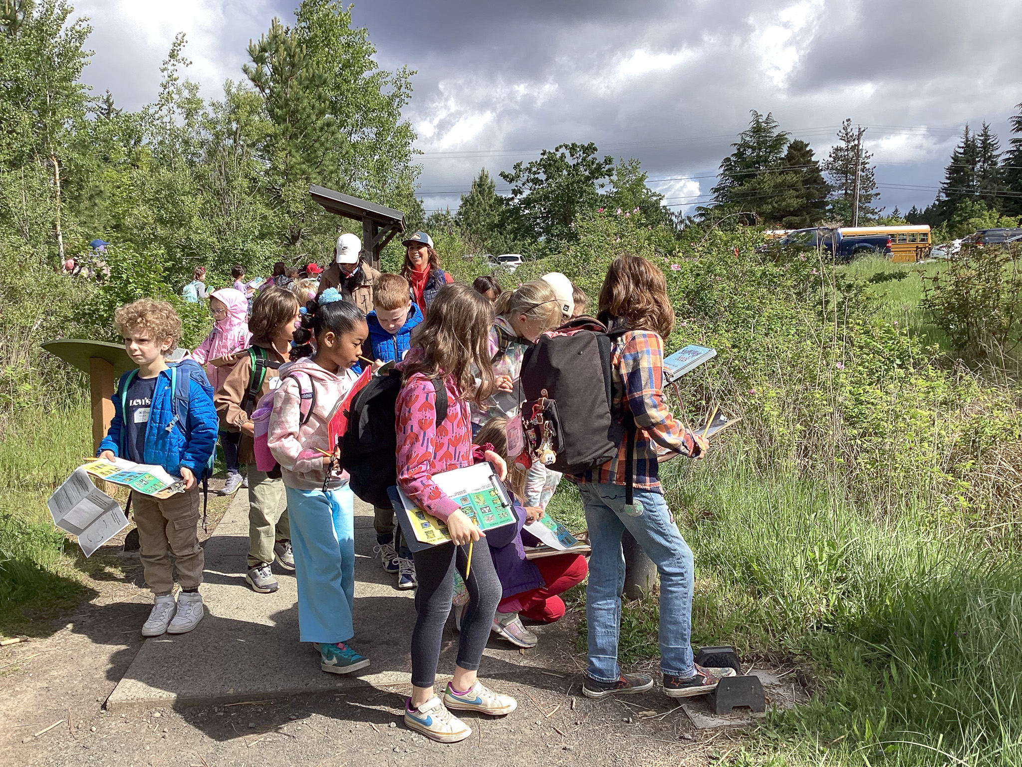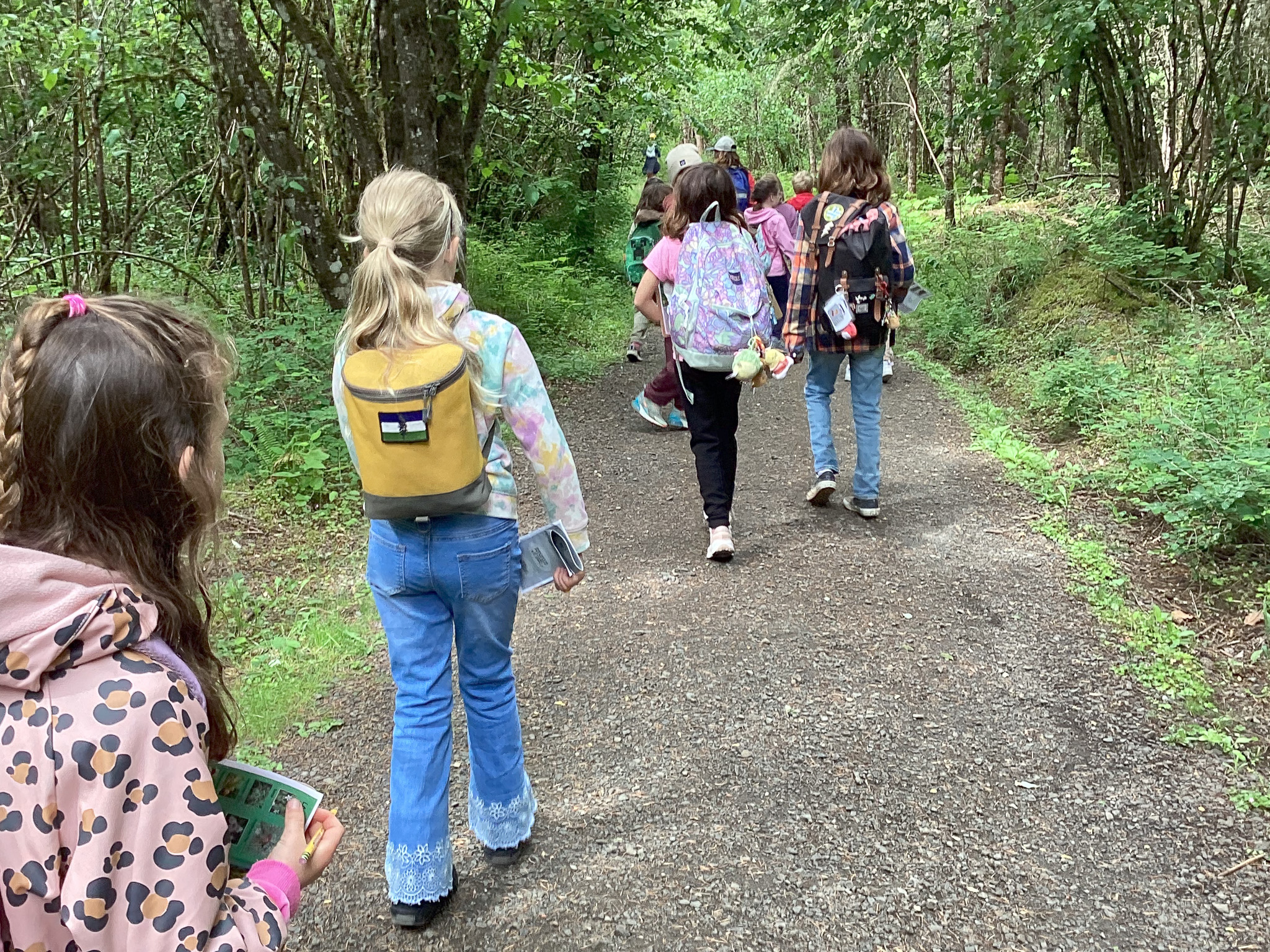 Second graders headed off campus to Cooper Mountain Nature Park for their field studies. After they arrived at the park, they went on a hike together. They looked for different plants and animals, trying to identify them with a scavenger hunt. They had lunch and spent time playing. In the afternoon, they painted the landscapes of the park with art teacher, Alex.